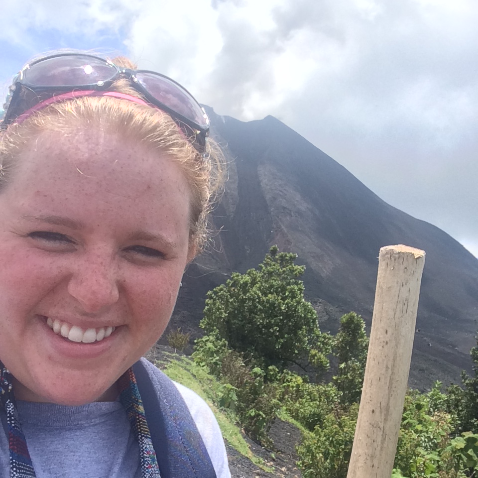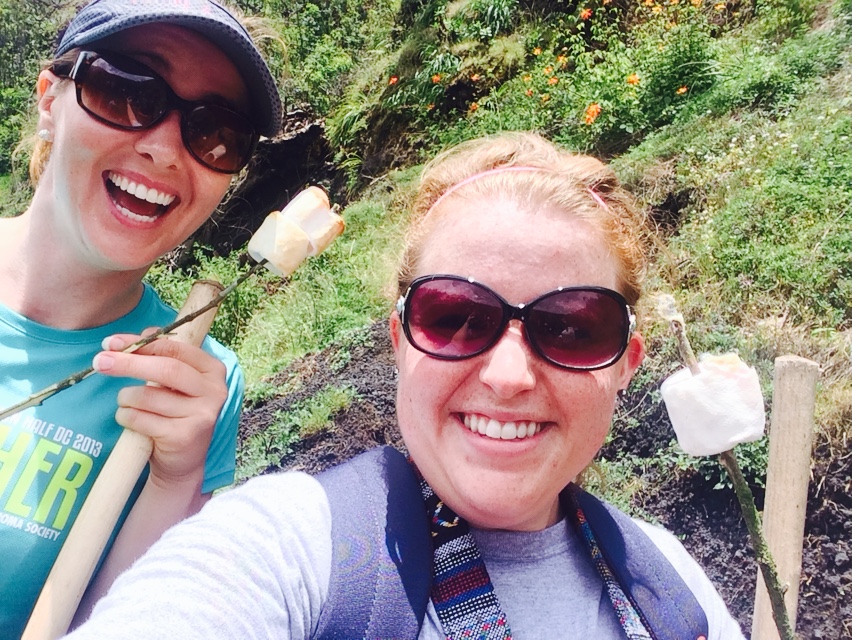 Next was my favorite part… we got to roast marshmellows in a small hotspot hole that they found/dug that where you could see a bit of the lava. I know it goes without saying but it was SO HOT. In the picture, where you can see my hand holding the stick, I could only leave it there for a few moments at a time. We then stopped by the “Lava Shop” that sold jewelry and small woven bags, with much of the proceeds going back into education. I bought these three small rings made from the lava rock that came with bags for my mom, my sister and myself (Surprise Mom and Jancz!) The triangle represents the volcano, which Guatemala considers sacred in their culture. I was told that if you are feeling negative energy you wear pointing one way, and if the energy is positive, you wear it the other way. The circles represent the lake crater at the other volcano across the valley in many of my pictures. This is the “Agua” volcano, which is dormant. In 1541 (?) it rained so much that it filled one of the craters, creating a lake.