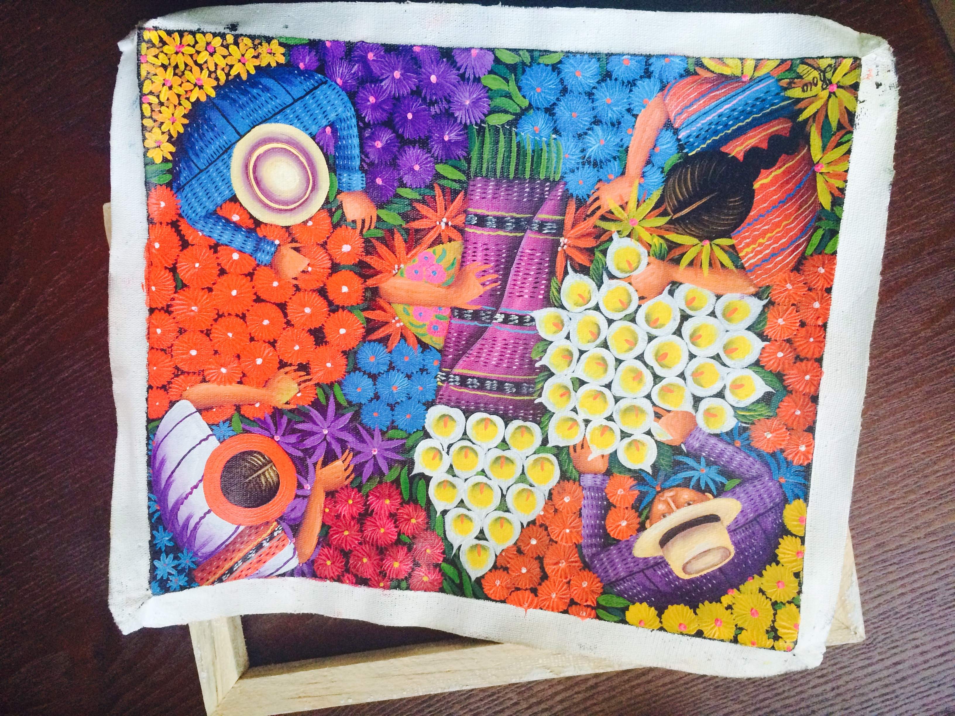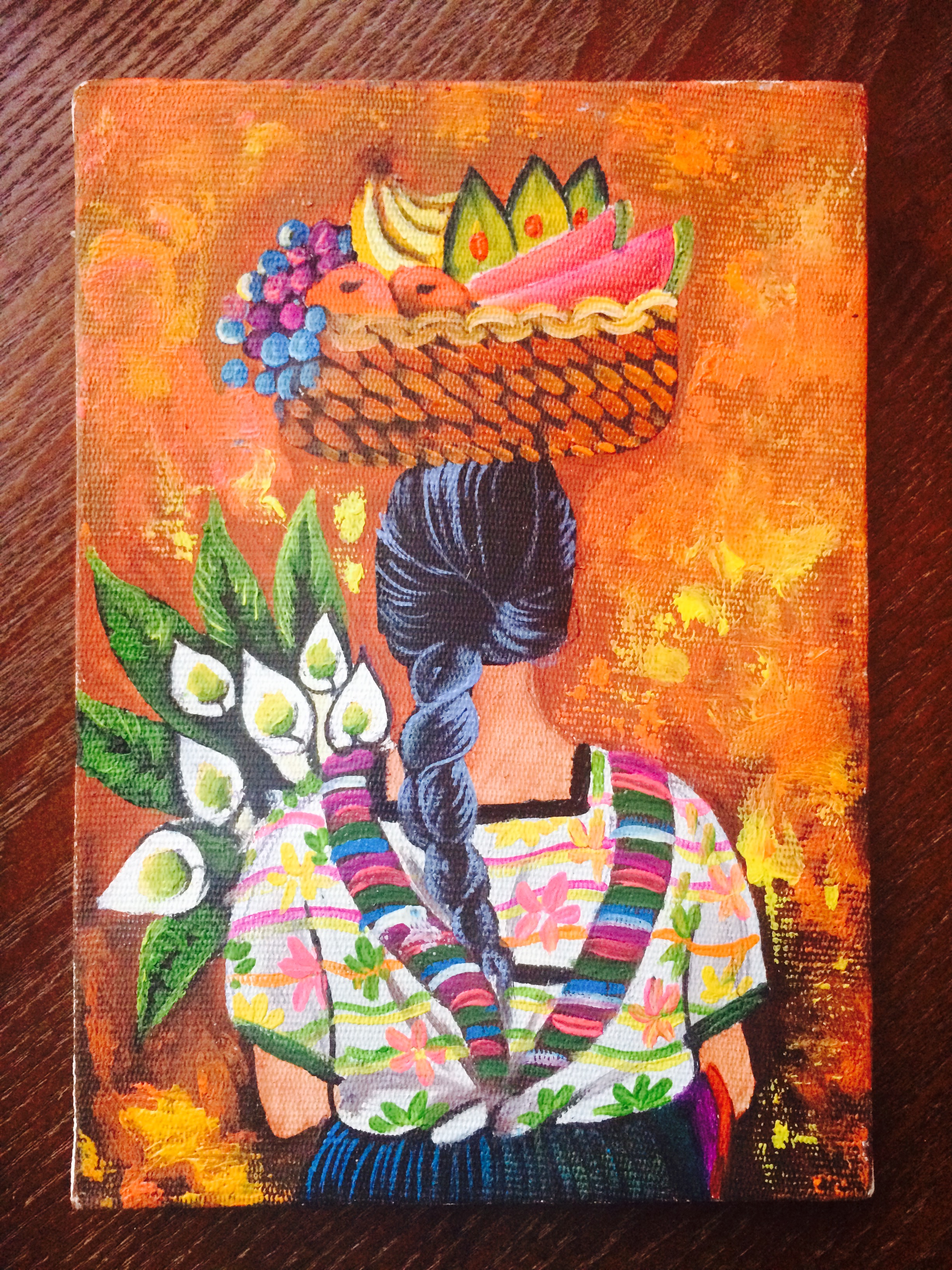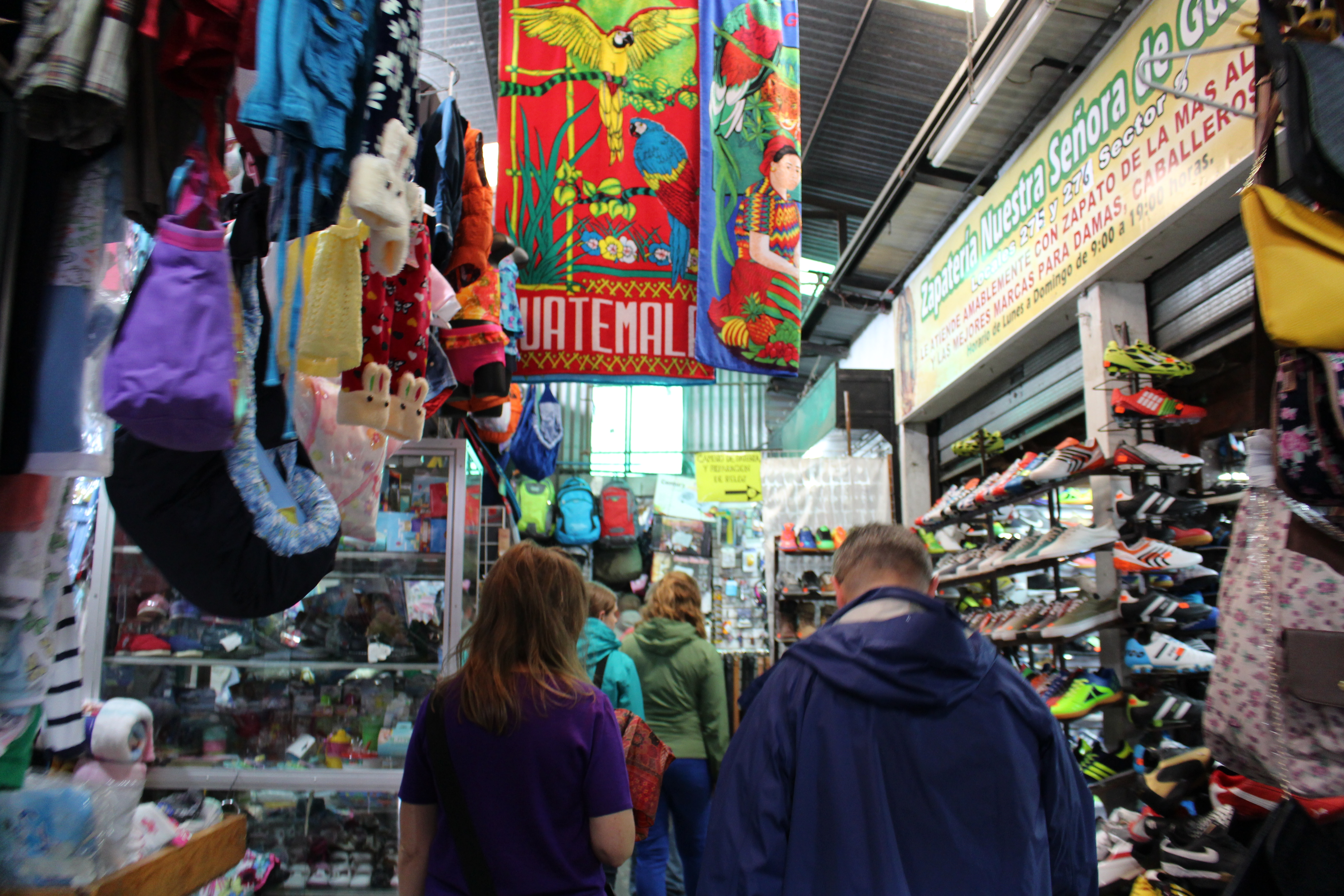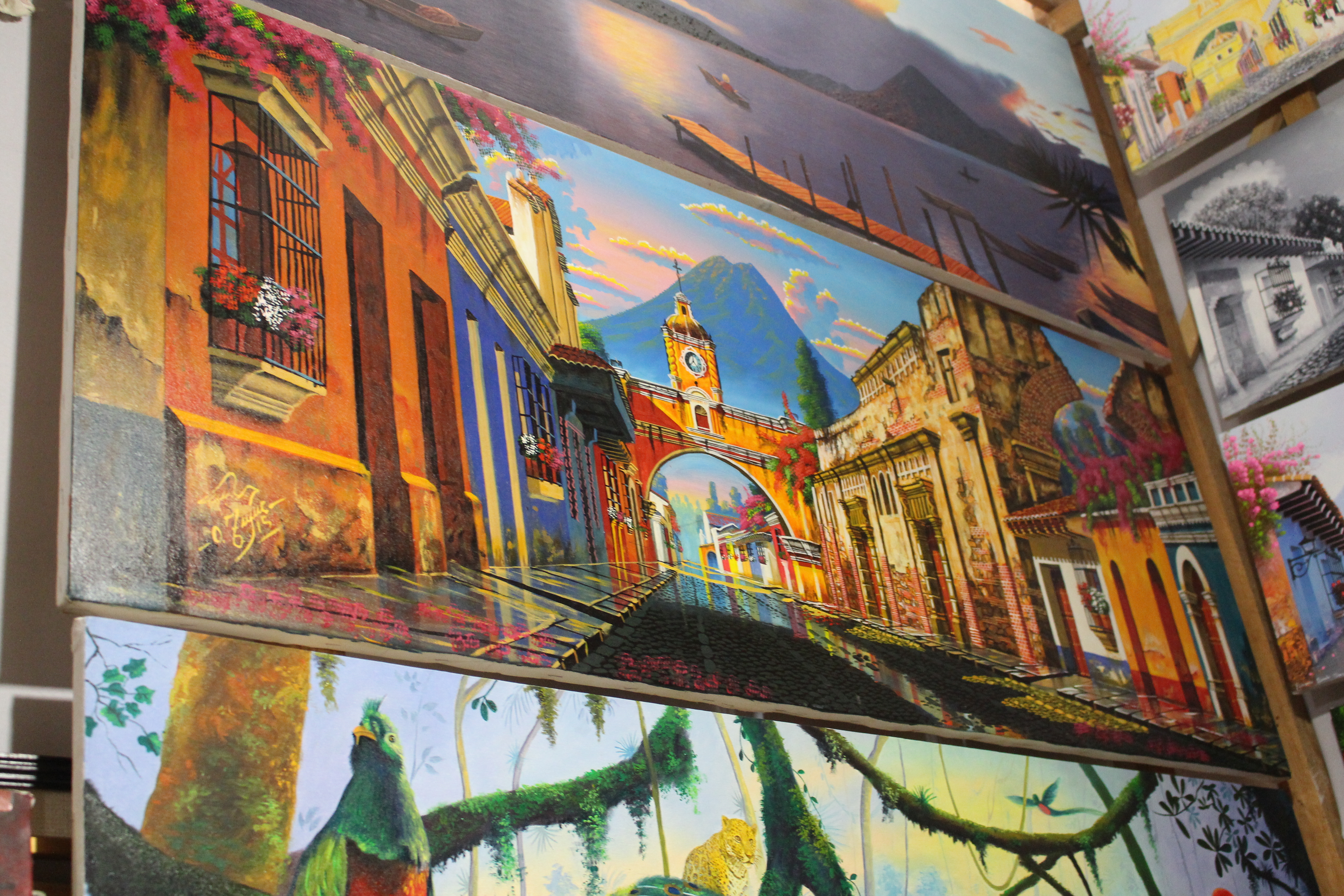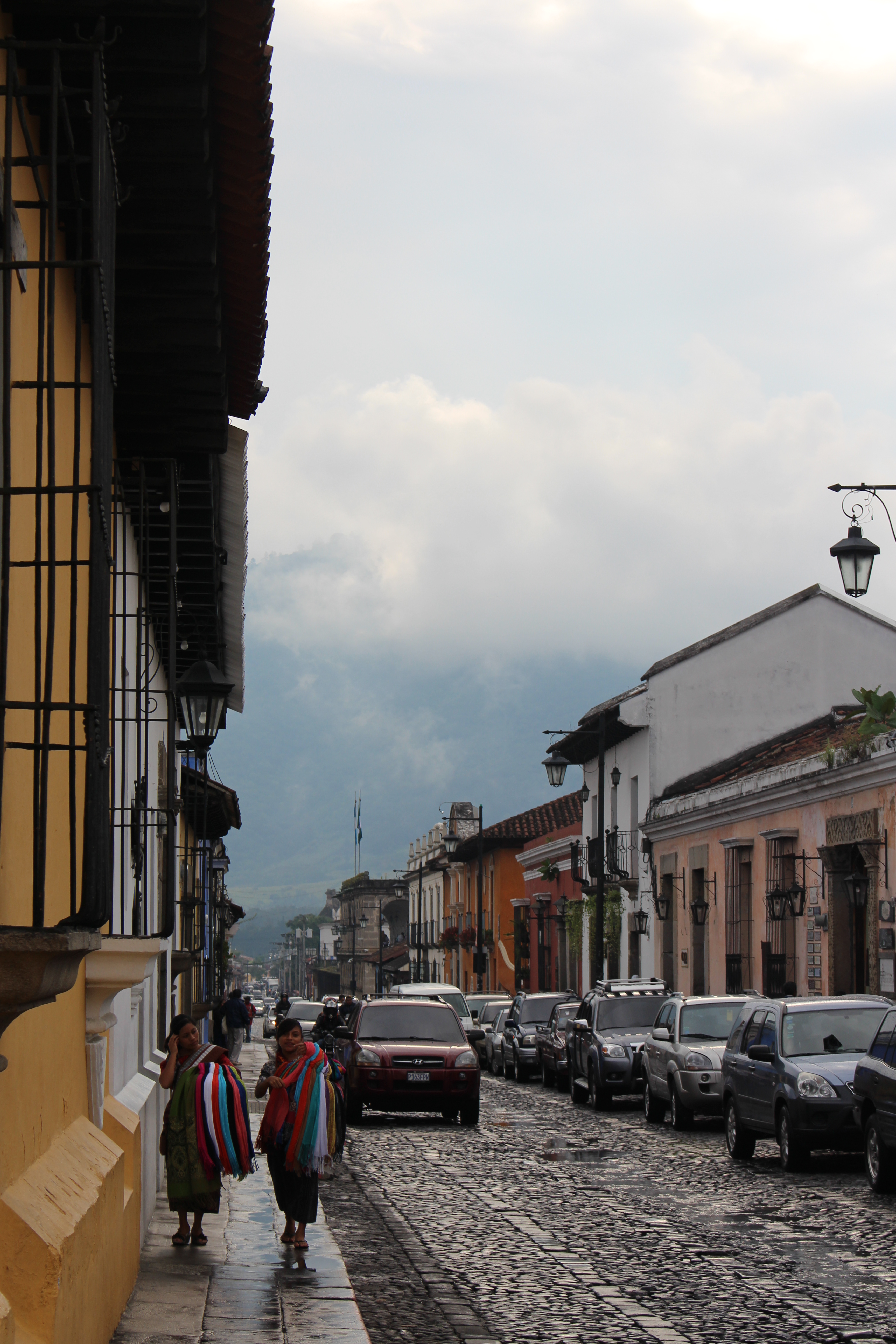 We spent the rest of the afternoon walking around two different markets. The first was less touristy, with lots of household and general items mixed in. The one thing I noticed all over Antigua that that there were a lot of shoe stores, pharmacies and bakeries. The second market had more of the type of items that we were interested in buying and was settled around the city’s main square. It was so overwhelming, my pictures do not do it justice. I had decided before my trip that it would be hard to do too many gifts for people because I would have to mail them once I was home, so I (selfishly) just focused on a few things I wanted. My main priority was some sort of artwork for my office. Everyone in my office has decorations from all of their international travel and my space kind of sticks out. Everything was so beautiful and SO COLORFUL, which was also difficult because my living room décor is somewhat southwestern with lots of oranges, reds and blues, so everywhere I looked there were things that would fit so well in it. In the end I fell in love with the paintings. Originally I wanted a much bigger and slightly different version of the painting of the women, but even with the help of my co-worker bartering skills, we couldn’t get the guy down on the price, and I settled for two equally as beautiful paintings. The bigger one, which I’ll have to have restretched, will go in my office and the smaller one will probably stay at home.