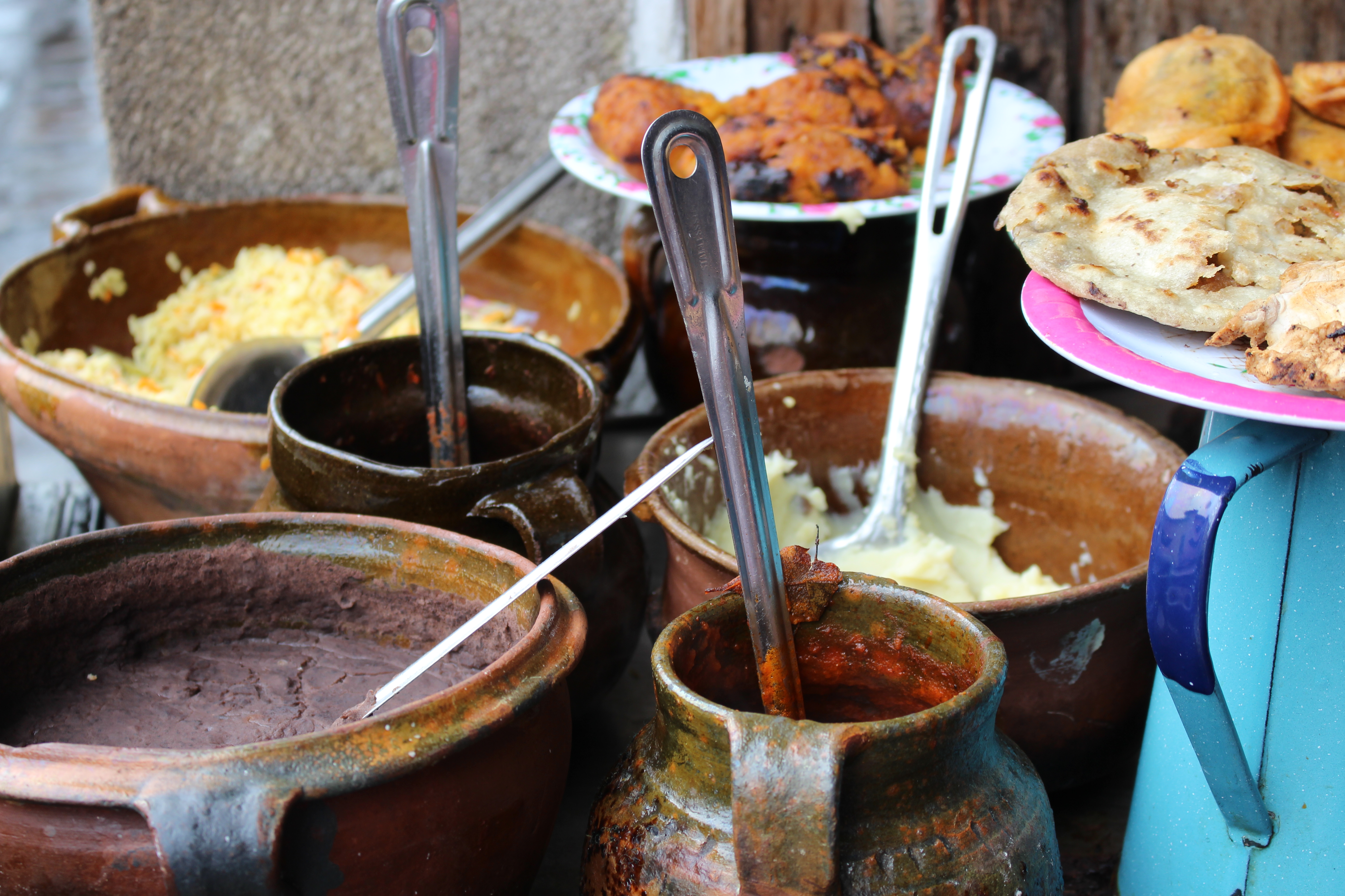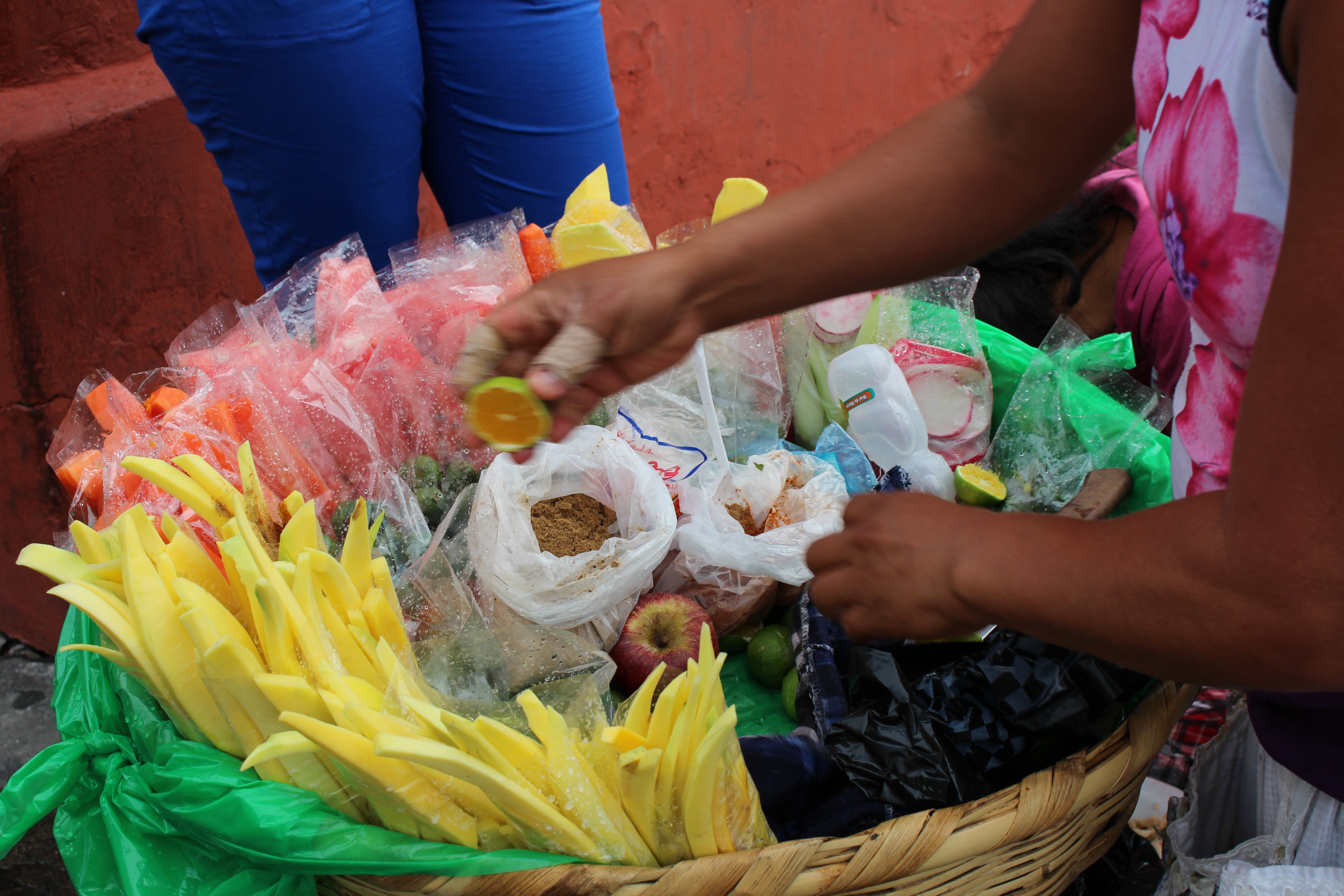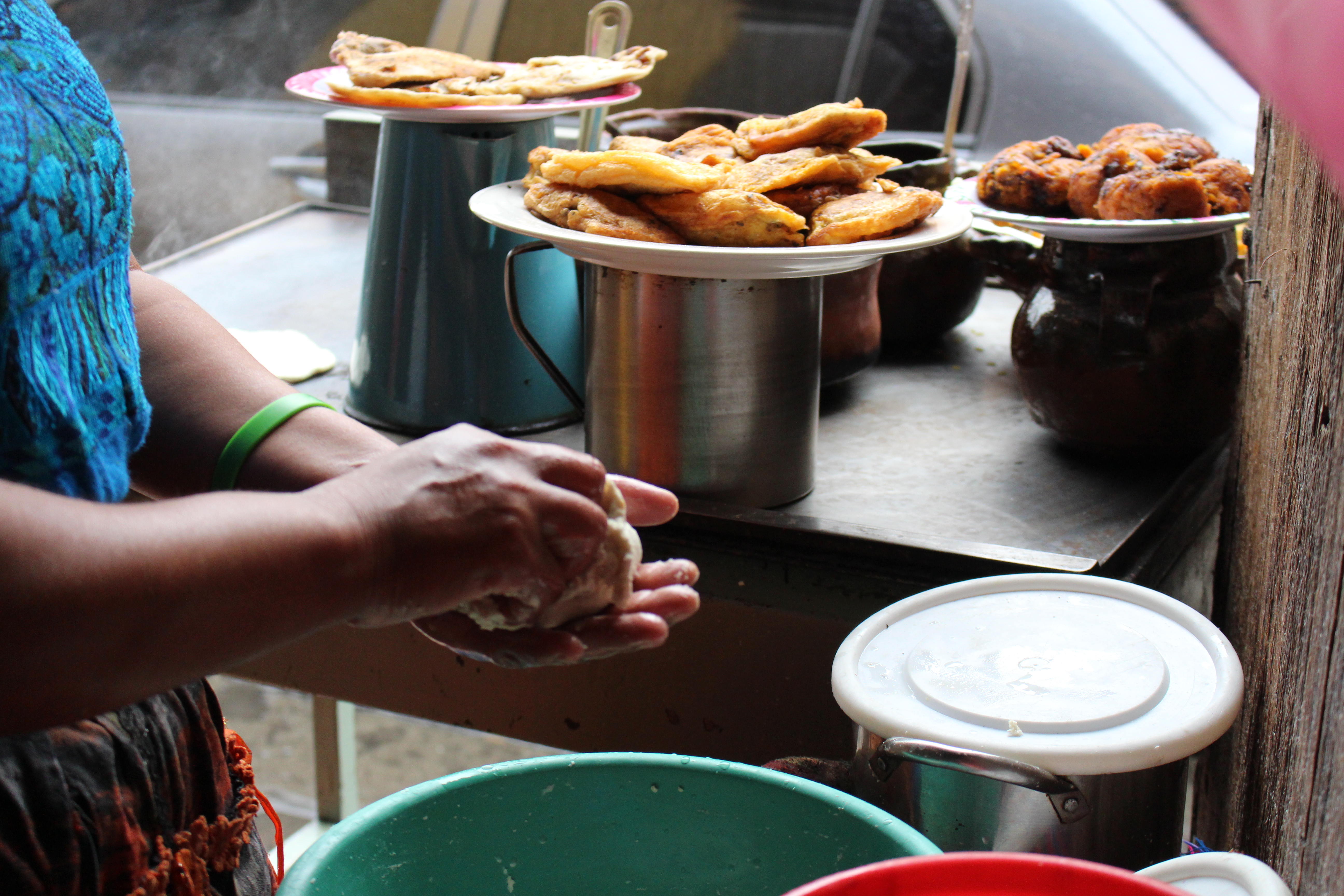 We started out by getting some street food for a late lunch. I know that sounds a bit sketchy, but one of my co-workers, who is also fluent in Spanish, has spent enough time traveling specifically in Central and South America that we trusted her judgment. I can’t quite describe what it all was, with the exception of the papusas that we recognized from the hotel, but it was all so cute. Our dessert from another stop was mango slices that were covered in sugars and spices. It was a different taste, reminding me of some of the Mexican candy that I grew up around in Eastern Oregon. We also stop in a bakery (which are everywhere) to buy some wafer like cookies to share, as well as some tortillas to take home.