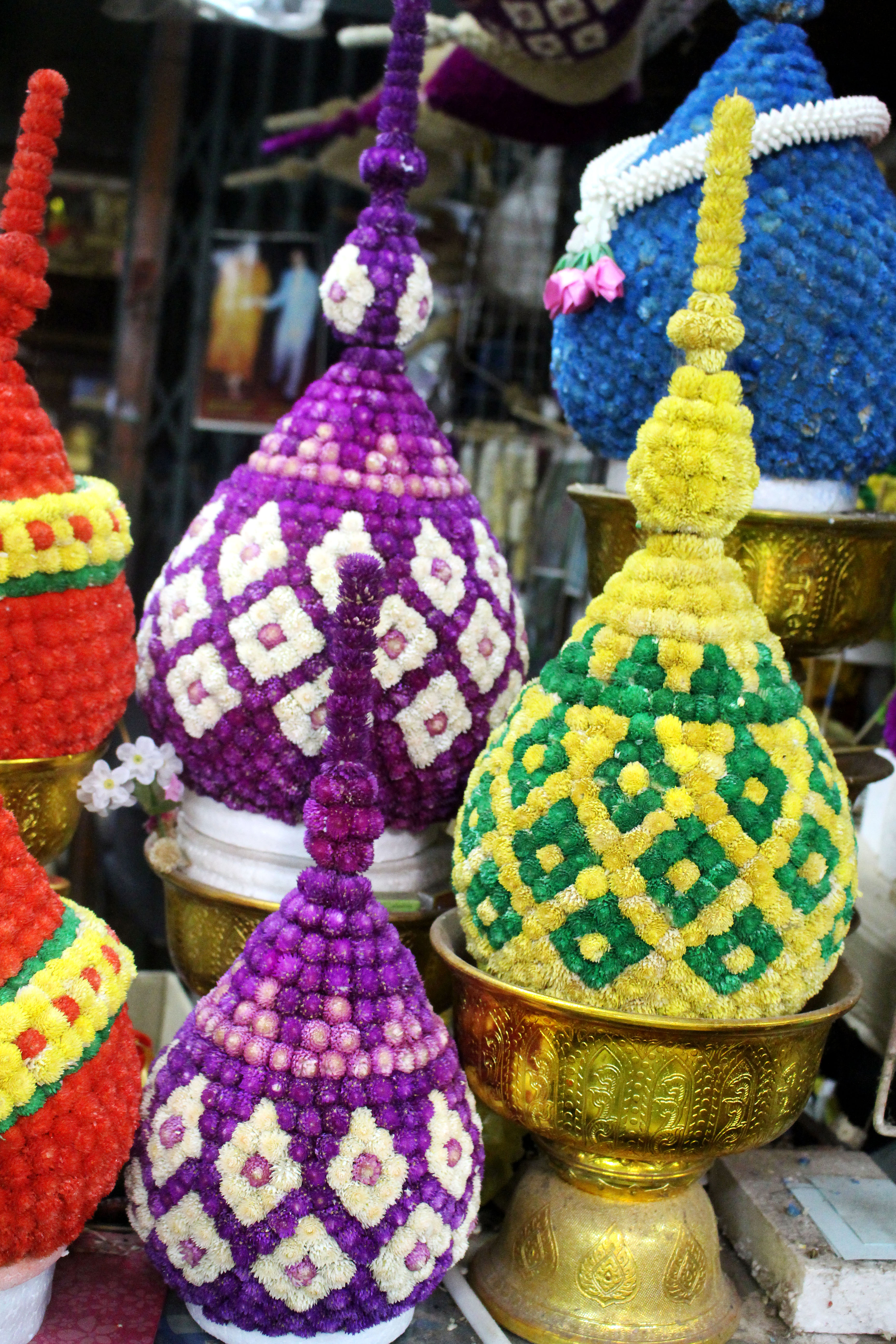 These were really cool arrangements made of really little (about the size of a penny or dime) flowers. When we were inspecting them a Thai women who was designing one gave us one of the flowers.