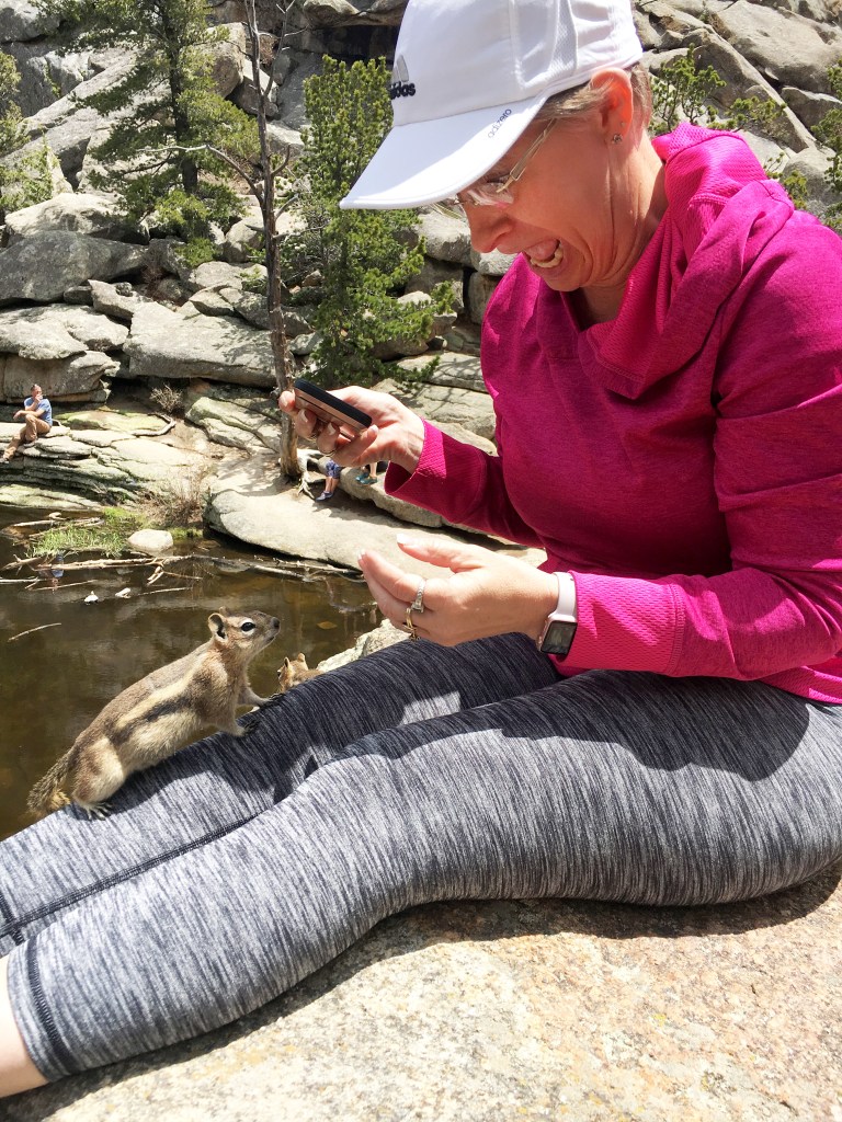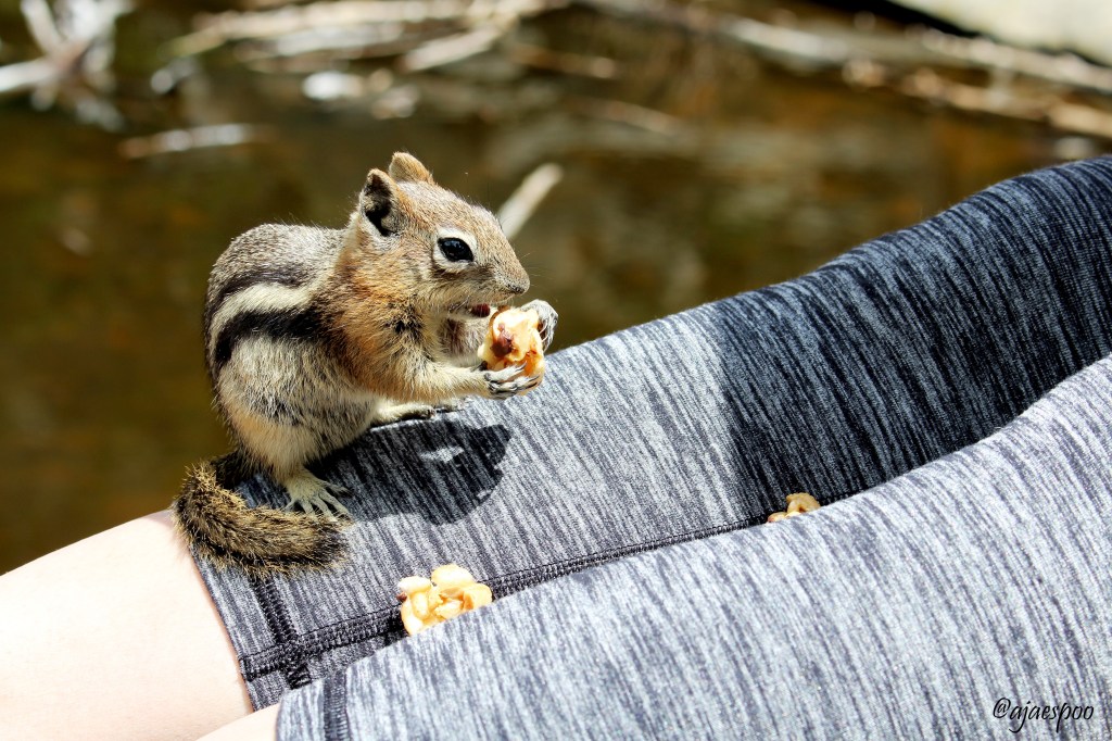 So growing up in Oregon, I know that you’re not really supposed to feed the wildlife, but we didn’t go up there planning too. Another hiker near us had her granola bar snatched right out of her hands by a squirrel and when she got up to leave she left of with a few nuts she had leftover, so by then we were already too entertained and curious about how close they would get to us.