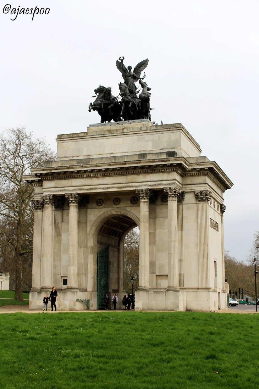 The Wellington Arch sits on the corner of Hyde Park and Green Park, along the route from Buckingham Palace to Kensington Palace.