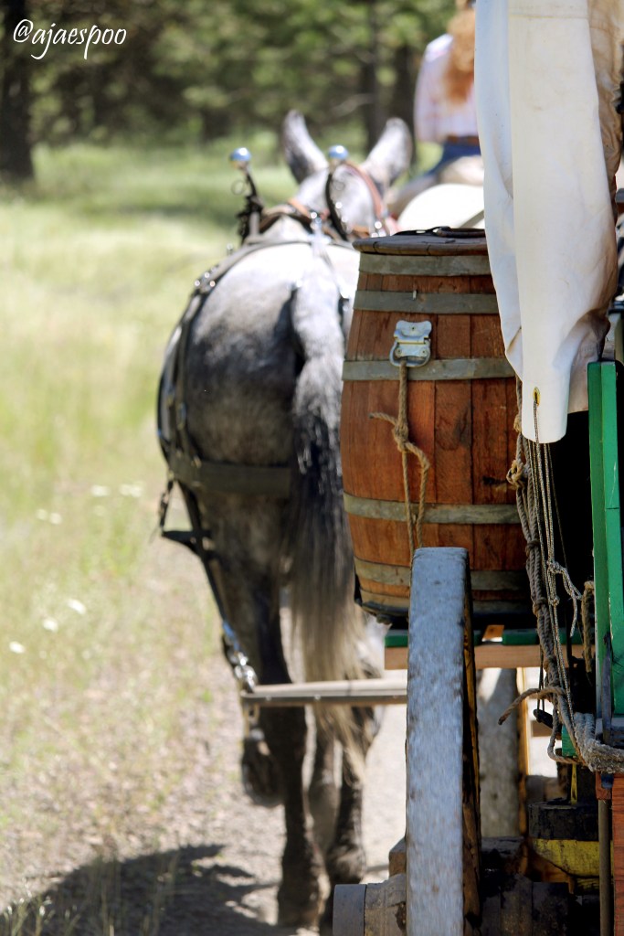 For many years, the wagon train group would actually move camp each day or every couple of days but more recently they’ve kept a base camp and go out on different routes from there each day. There are outriders, folks that just bring their horses to ride, and then there are the teams (both horses and mules) that pull the wagons. There are also a few single-horse carts. The first day I went out with the Meyers family (who I’ll share more about in an upcoming post) and their two teams. The second day I rode with Jill Perrine and her single-horse cart.