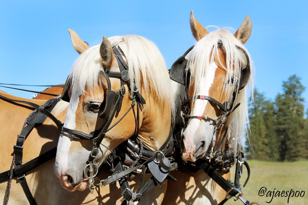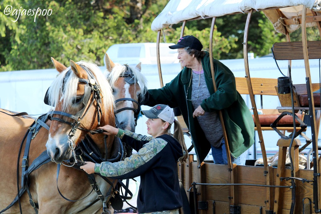 The Meyers’ have two teams of Belgian Draft horses. There are the geldings (males) Gus and Call who are 20 years old and have been with Rochelle’s father-in-law Bill, since 2001. The team of mares (females), Kayla and Angel, 9 and 11 years old respectively, have been with Rochelle and George since 2016.