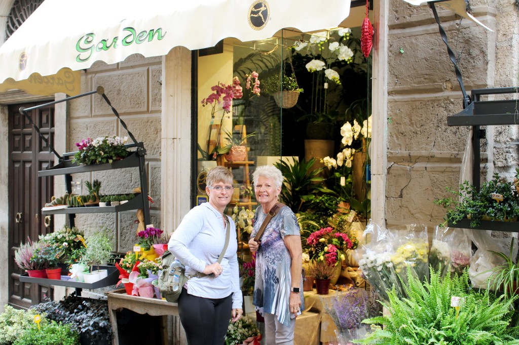 Two florists checking out a flower shop in a different country.