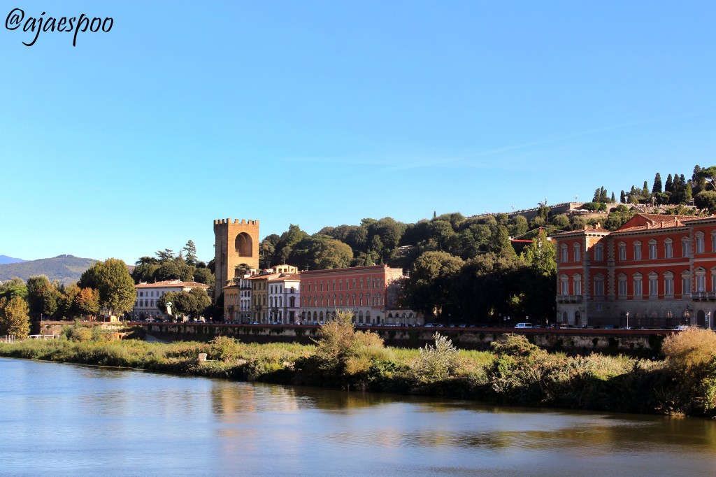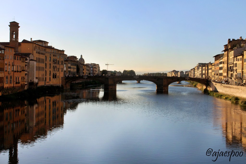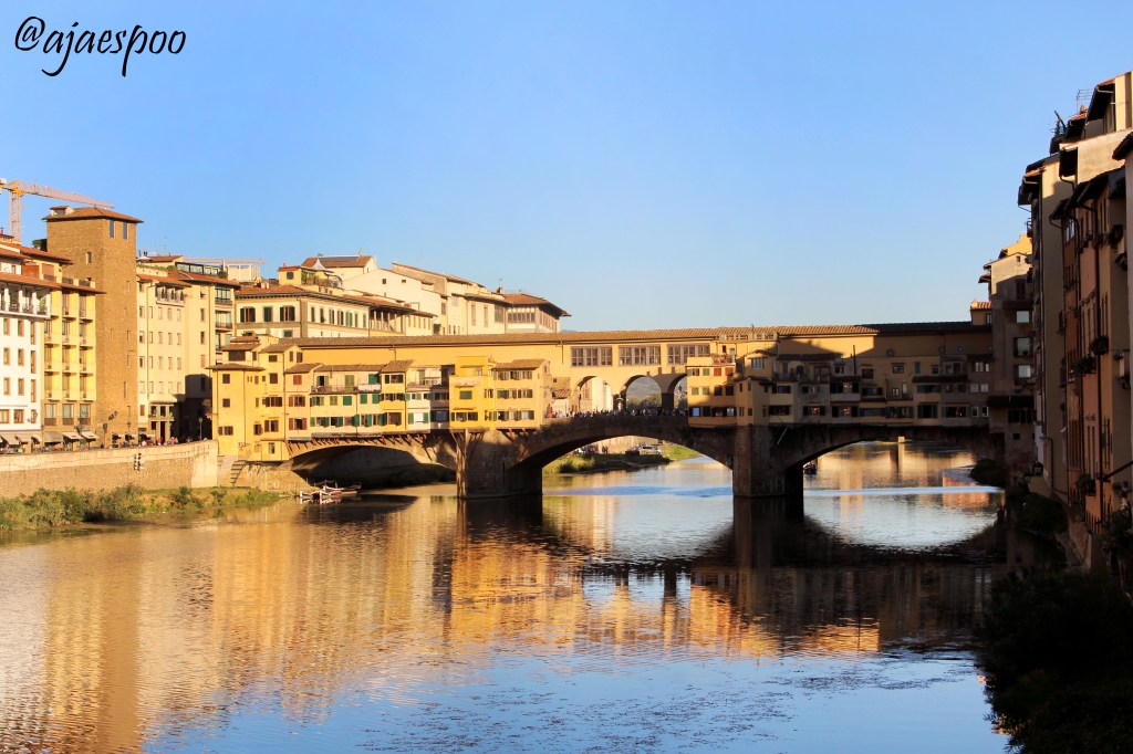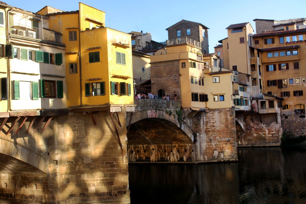 This bridge is named the Ponte Vecchio. Until 1218, it was the only bridge in Florence that crossed the Arno River. It is known for having shops built along it, which traditionally was much more common than it is now. Originally this shops were occupied by butchers, but now it houses mostly jewelry and art.